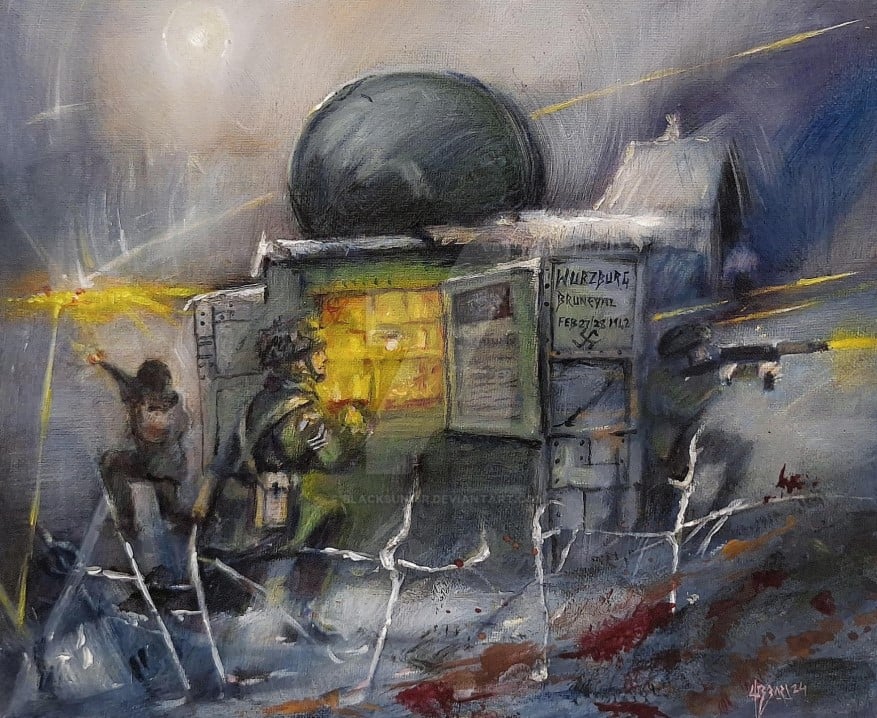 My signed painting, 12xl0 inch canvas board inspired by Op Biting, Bruneval Raid. 27/28 Feb 1942, on the German radar station, carried out by British Airborne forces.,