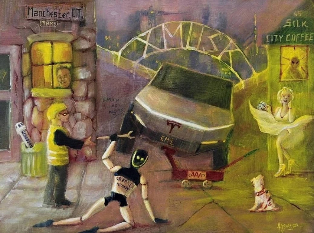 Style and Mood: The painting uses vibrant colors and a cartoonish style, creating a playful yet slightly chaotic mood. The mix of familiar earthly elements (like the Tesla car and Marilyn Monroe figure) with Martian and sci-fi elements (the setting, alien, and robot) creates a surreal narrative, possibly exploring themes of technology, space colonization, and creativity.