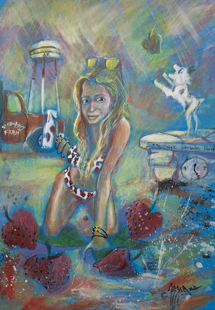 Strawberry Farm Pinup art Drawing on size A4 card, signed and dated. UK USA Worldwide shipping from UK.